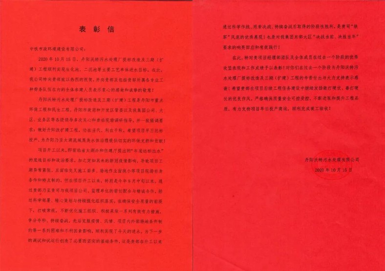 公司丹陽沃特污水處理廠提標(biāo)改造及三期(擴(kuò)建)工程項(xiàng)目部與丹陽沃特污水處理有限公司、監(jiān)理單位密切配合、精心策劃,持續(xù)強(qiáng)化組織落實(shí),先后克服疫情、汛情、項(xiàng)目?jī)?nèi)外部場(chǎng)地條件制約等困難,于10月15日順利實(shí)現(xiàn)生化池、二沉池等主要工藝單體進(jìn)水目標(biāo),充分展現(xiàn)了市政“鐵軍”風(fēng)采。為此,丹陽沃特污水處理有限公司特發(fā)表彰信至公司,表示衷心感謝和誠摯敬意。